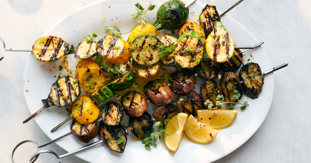 When it’s this warm and the produce is this good, dinner can just be a load of vegetables. Season zucchini and eggplant with garlic, oregano and red-pepper flakes, as Melissa Clark does here, and thread them on skewers for a simple meal that looks spectacularly summery. To round out your meal, pair them with skewers of paprika-dusted grilling cheese.