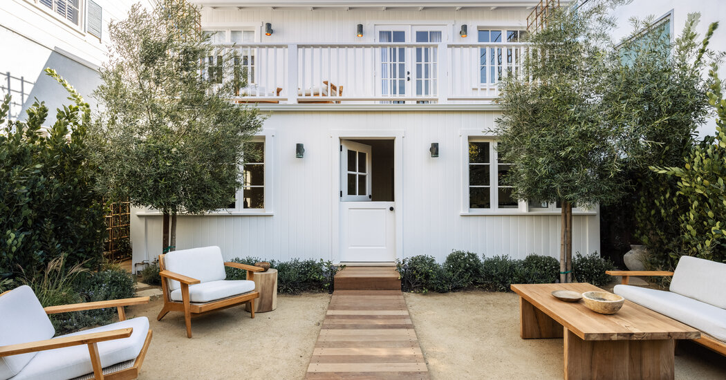 The open living area beyond has light hardwood floors, cream-colored wood walls and ceilings, and furnishings by the fashion and lifestyle designer Jenni Kayne, which are available to buy.