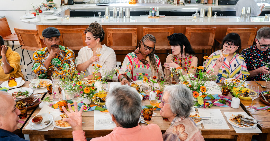 The food: In the courtyard, guests snacked on Asian pears, Japanese peanuts and deep-fried corn kernels. The confectionery artist Manami Sano, 46, of the sweets company Studio Miyabi, offered handcrafted nerikiri, chrysanthemum-shaped white bean paste sweets stuffed with black sesame. The chef Anna Osawa, 39, a co-owner of the pop-up omakase Sushi Salon, passed around miso baked oysters and other appetizers. Once everyone had a seat, Rice-Cisneros brought out family-style platters of rich red mole sunk with charred sweet potatoes and red beans, pork adobo folded into fragrant corn tortillas, a salad of fresh figs and crunchy jicama and spicy beets rolled in salsa macha. For dessert, the pastry chef Noelle Malone, 25, served a très leches cake flavored with matcha.