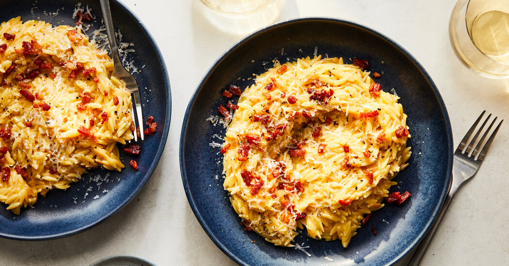 In this recipe, the chicken stock is added all at once, and the orzo needs a mere 7 to 9 minutes to plump over a gentle flame. You can take comfort in knowing that your end result will eat like a risotto in half the time and with much less stirring — and your mouth will be coated with carbonara’s perfect emulsion of cheese, egg and pork fat.