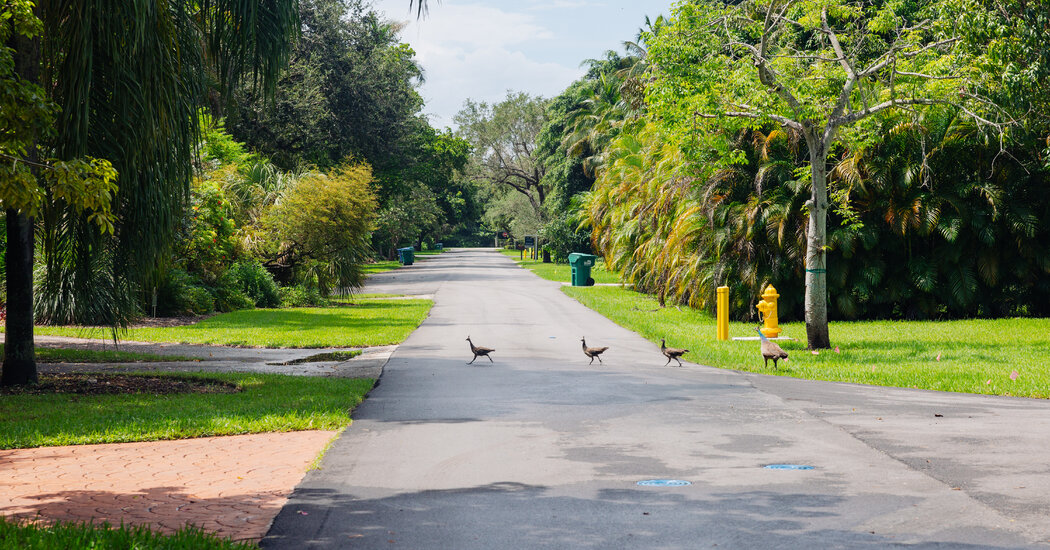 Long a mainstay in bohemian Coconut Grove, a Miami neighborhood up the road, the nonnative birds began making their way south in recent years, local officials suspect, because old Grove cottages were being turned into immense modern houses that chipped away at the area’s lush tree canopy. In the affluent village of Pinecrest, the peafowl found larger lots with plenty of greenery that were far more to their liking.