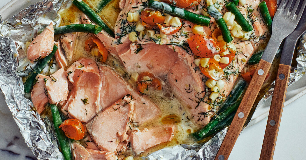 There’s Yewande Komolafe’s coconut-dill salmon with green beans and corn (above), which she prepares entirely on the grill, using foil packets to bathe the fish in a fragrant mix of coconut cream, herbs, mustard and lemon. The foil keeps the fish from sticking to the grate and contains its fragrant sauce, which is also used to dress a salad of green beans, corn and tomatoes. And if you don’t have a grill (or don’t want to step out of the air-conditioning), the recipe works in your oven.