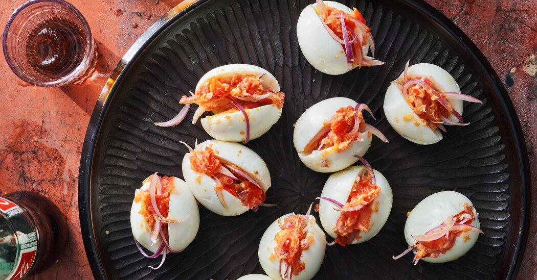 I first encountered these brightly dressed eggs while sitting under the warm, shade-speckled light of a large tree in Prospect Park, Brooklyn. A few friends and I had successfully wrangled our busy schedules, gathering our partners and kids on a large patterned blanket for a picnic. We caught up excitedly, filling our plates with snacks, including these eggs. The jewel tones of their juicy red and purple garnish stood out against the firm-set, oval whites. In one bite, I was hit with the sweet acidity of summer tomatoes, tempered by a creamy soft-boiled yolk. The crunch of raw red onions and a tingle from Scotch bonnets accented each subsequent bite.