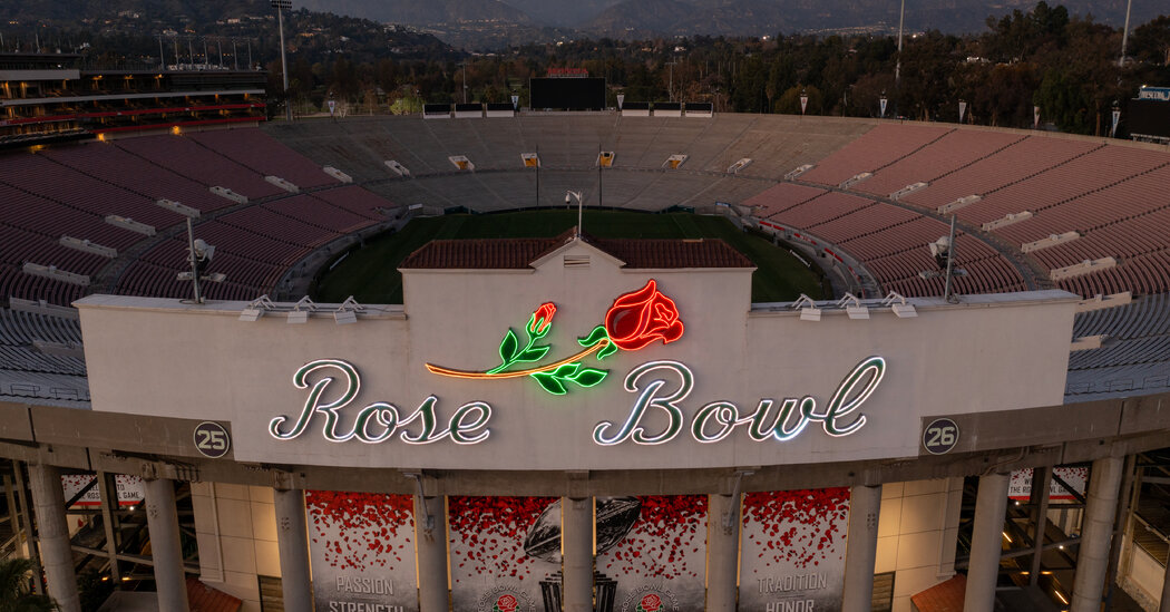 Inside, the stadium is a canvas come to life. The grass is always the most lush green, and the end zones — painted the colors of the two teams — and the midfield rose are the most vibrant. In most years, as the sun sets late in the third quarter, the spectators — and the million homebound viewers shut in by a winter freeze — are treated (or taunted) by the sunlight dappling the San Gabriel Mountains hues of orange, pink and red.