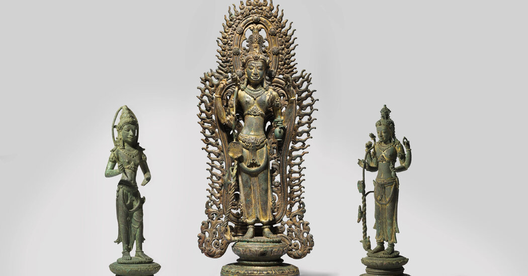 The sculpture of the Bodhisattva Avalokiteshvara Padmapani — the benevolent “lord who looks on from above” and “lotus bearer” — dates to the ninth or 10th century. Over about 15 years, it traveled from a rural area near the Vietnamese border to the hands of Douglas A.J. Latchford, a notorious trafficker of Asian antiquities. In 2011, he in turn sold it and two smaller accompanying statues to the National Gallery of Australia, where they have resided ever since.