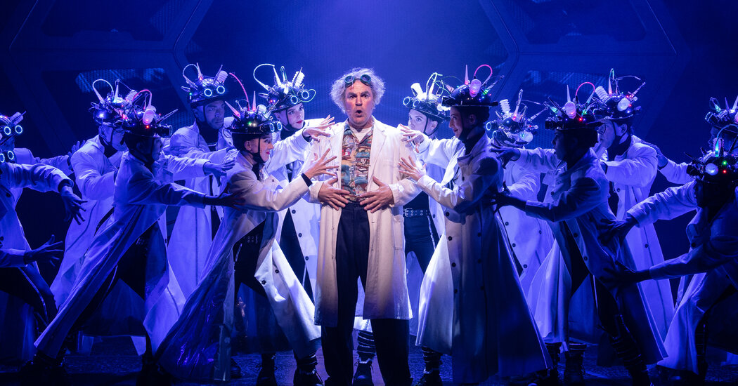 And yet it’s not really faithful. The movie is carefully balanced in tone; the musical is dialed up uniformly to 88 m.p.h. Coles, a carry-over from the 2021 London production, which won the 2022 Olivier award for best new musical, essentially duplicates and then vastly exaggerates Crispin Glover’s already exaggerated George. Bart, too idiosyncratic merely to copy the idiosyncrasies of the movie’s Christopher Lloyd, instead adds a descant of commentary atop them, sometimes seeming to extemporize a different show entirely. And Likes, though not at all reminiscent of the expert Michael J. Fox in the movie — in tribute to whom there’s a nice Easter egg — is given nothing new to do except sing, which he does very well.