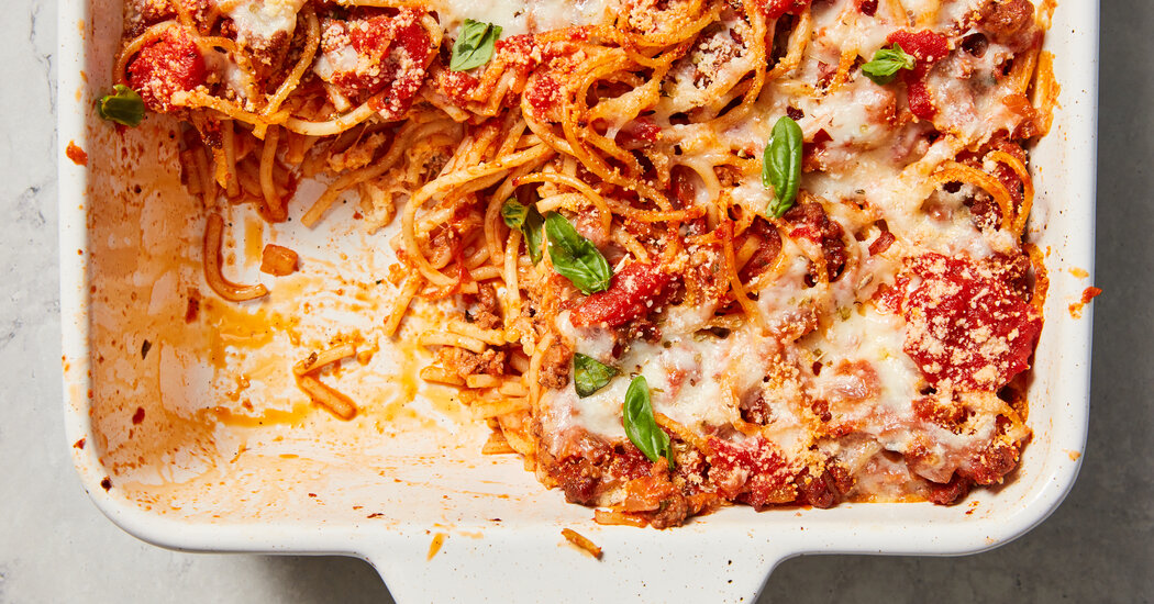 Don’t let the cooking time scare you — most of that hour and a half is spent in the oven. Aside from chopping an onion and however much garlic you like (I’ve always read the garlic amount in recipes as a minimum), the rest of the prep time is spent on easy stirring and mixing. Baked spaghetti bends to you: Swap in the Bolognese you stashed in the freezer for the jarred marinara, use Italian chicken sausage instead of ground beef, tuck in some leftover roasted vegetables. Just don’t skip the ricotta and mozzarella, which turn this baked pasta into an instantly lovable spaghetti-lasagna hybrid.