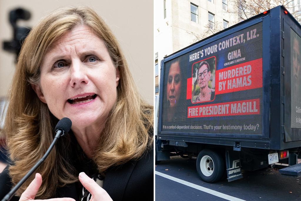 The trucks also played a looped clip of Magill’s congressional hearing testimony from Tuesday, with Rep. Elise Stefanik (D-NY) asking her: “Does calling for the genocide of Jews violate Penn’s code of conduct when it comes to bullying and harassment? Yes or no?”