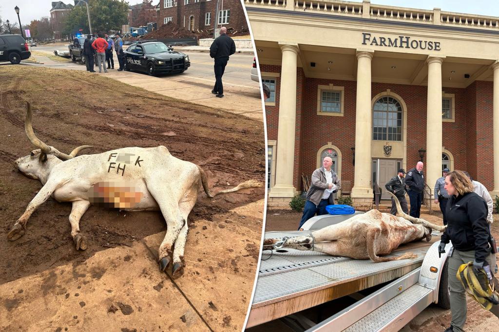 According to police in Stillwater, Okla., the carcass was found on the lawn of the FarmHouse fraternity and there was an expletive carved near the side of the body.