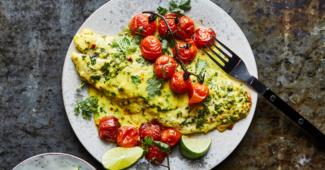 So I understand why Yewande Komolafe’s coconut fish and tomato bake has over 4,000 reviews and a five-star rating: It’s flexible, forgiving and incredibly flavorful. Marinate any fish fillets you like (skin on or off, your call) in a golden bath of coconut milk, turmeric, honey, chile, garlic and ginger, then give them a short bake in the oven. Yewande gives clear directions for how to bake your fish to just the right point before switching to the broiler, which finishes the cooking and blisters the cherry tomatoes.