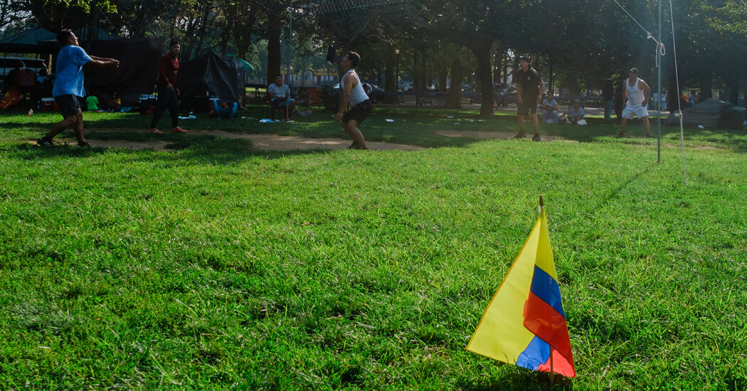 “It is very important for our community,” said Arnold Saquipulla, a welder who is from near Cuenca and has been playing ecuavoley in the park for 20 years. “People work hard. This is what we love to do to relax. It keeps us connected.”
