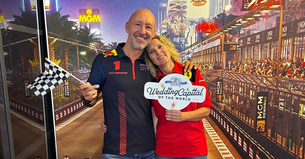 Las Vegas, which is known as “the wedding capital of the world,” already has about 100 chapels in the city that offer easy 15-minute ceremonies. The Las Vegas Grand Prix team also decided to set up a pop-up chapel for race fans, with neon hearts, a racecar that said “just married,” and a sign that said “Lights out and together we go.” (This is a phrase David Croft, a Sky Sports commentator, would say at the beginning of each Formula One race.)