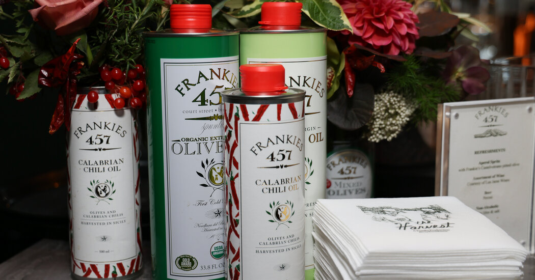 Frank Falcinelli and Frank Castronovo, the owners of Frankies 457 in Carroll Gardens, Brooklyn, also happen to have a piece of the Asaro Family Farm, in the Belice Valley in southwest Sicily. The Franks have added some new products bearing the restaurant’s name. A basic everyday oil, sold by the liter, is a blend of Nocellara del Belice, Biancolilla and hearty Cerasuola olives, all Sicilian natives, golden, with a peppery edge in its finish ($27.99 for 1 liter). Then there’s a Calabrian Chili Oil ($21.99 for 17 ounces), ruddy, with vibrant heat from three kinds of chiles blended into the Sicilian oil; the Franks suggest drizzling it on pizza. The organic extra virgin oil made entirely from Nocellara del Belice, greener and more herbal ($34.99 for 17 ounces), has been on the market for some time and is still available. They have also introduced six traditional organic pastas made from ancient grains, cut on bronze dies and air-dried ($7.49 a pound), and deliciously meaty Castelvetrano olives and whole Sicilian black (brownish) olives, each $8.49 for 12 ounces.