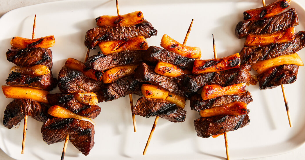 At the top of my to-grill list are these galbi and tteok skewers (above), a recipe from David Shim, the executive chef at Cote in New York City. Threaded with batons of soy and ginger-marinated short ribs and chewy-crisp rice cakes, these skewers make a hearty dish that you’ll be happy to cook well into sweater season, or even longer if you’re an all-year griller. You do need to plan ahead (marinating the meat makes a huge difference), but once you’ve gathered your ingredients, they’re easy to assemble.