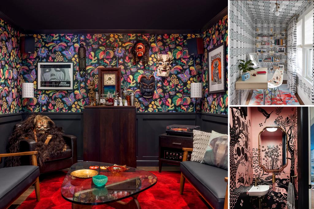 A tiny powder room got an exuberant pink-and-black, animal-print wallpaper. In a tight hallway next to a window, there’s a kaleidoscopic wallpaper, an abstract rug and a Basquiat-patterned chair.