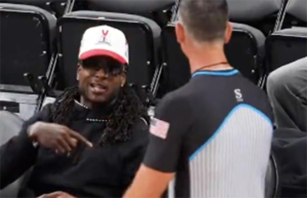 The captured interaction started with the referee bouncing a ball to Adams, who had courtside seats alongside former MLB outfielder Dexter Fowler.