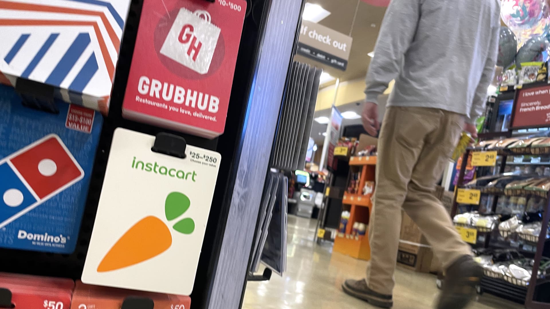 Instacart gift cards are displayed at a Safeway store on August 28, 2023 in San Anselmo, California.