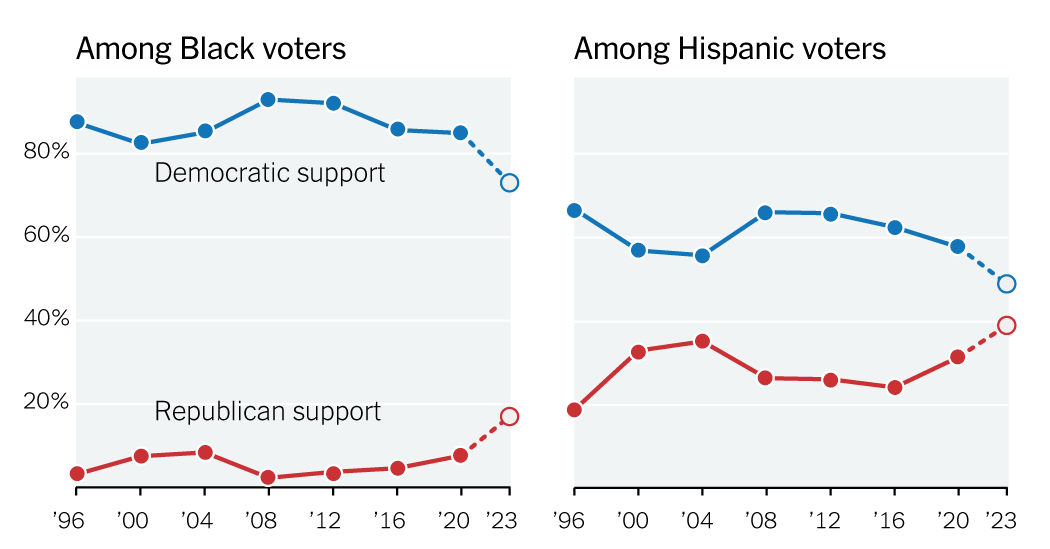 I’ve seen plenty of skepticism. Among nonwhite voters, a Democratic presidential candidate hasn’t fared as badly as those polls suggest in a presidential election result since the enactment of the Civil Rights Act in 1964. In the case of Black voters, the disparity between the usual support for Democrats — around 90 percent or more — and the recent polling showing it in the 70s or even the 60s just seems too much to accept. Some skeptics believe they’ve seen results like this before, only for Republican strength to vanish on Election Day.