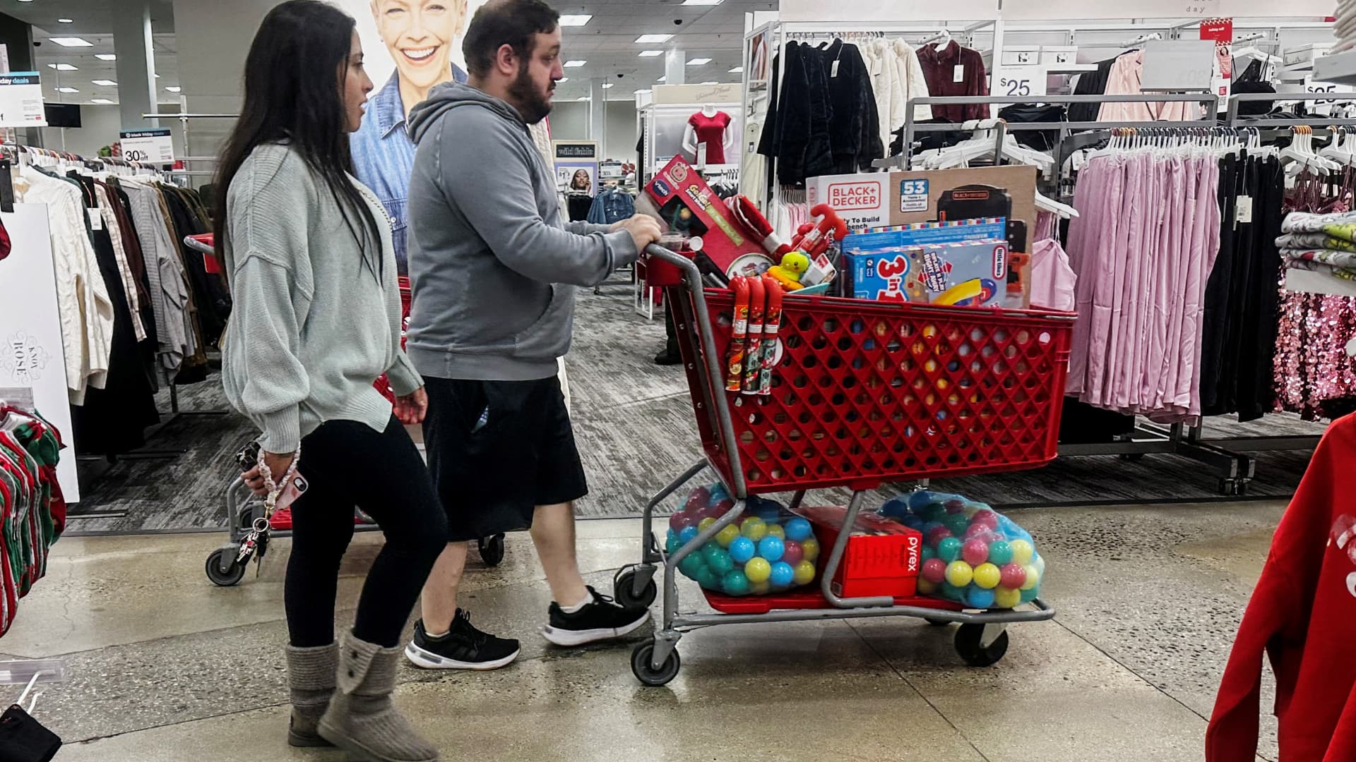 Shoppers walk with items during Black Friday deals at a Target store in Westbury, New York, U.S., November 24, 2023.