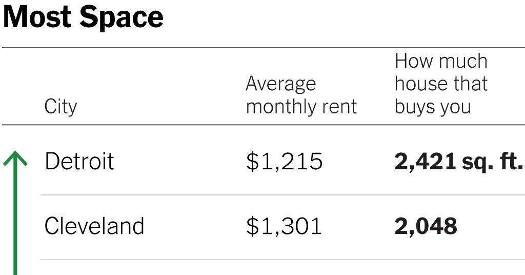 So where would you get the most space if you spent your rent money on a mortgage? The answer is Detroit, where the median rent of $1,215 could buy an expansive 2,421 square feet.