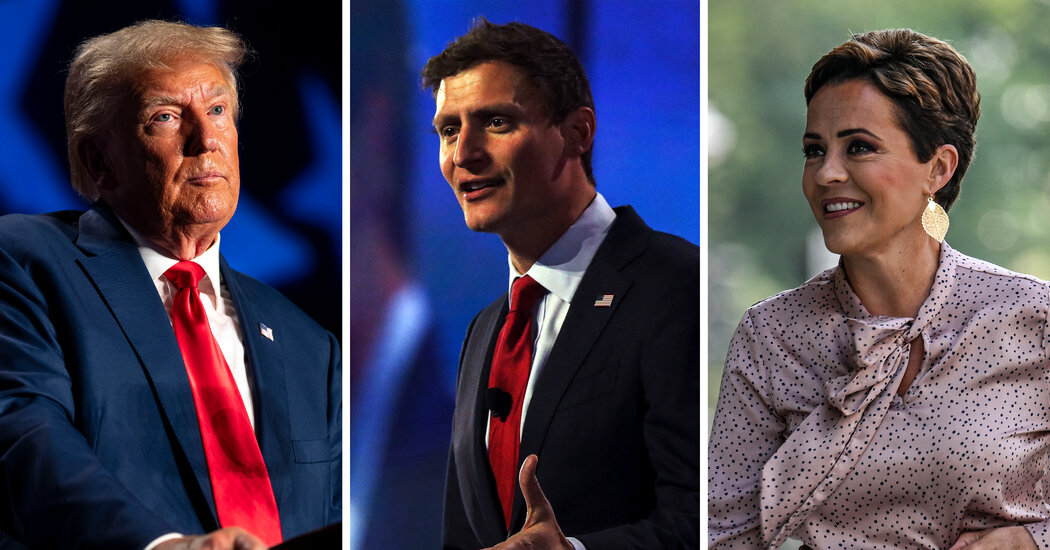 “Look at Kari — Kari’s winning with very little money,” Mr. Trump said. “And if they say, ‘How is your family?’ She says, ‘The election was rigged and stolen.’ You’ll lose if you go soft. You’re going to lose that base.”