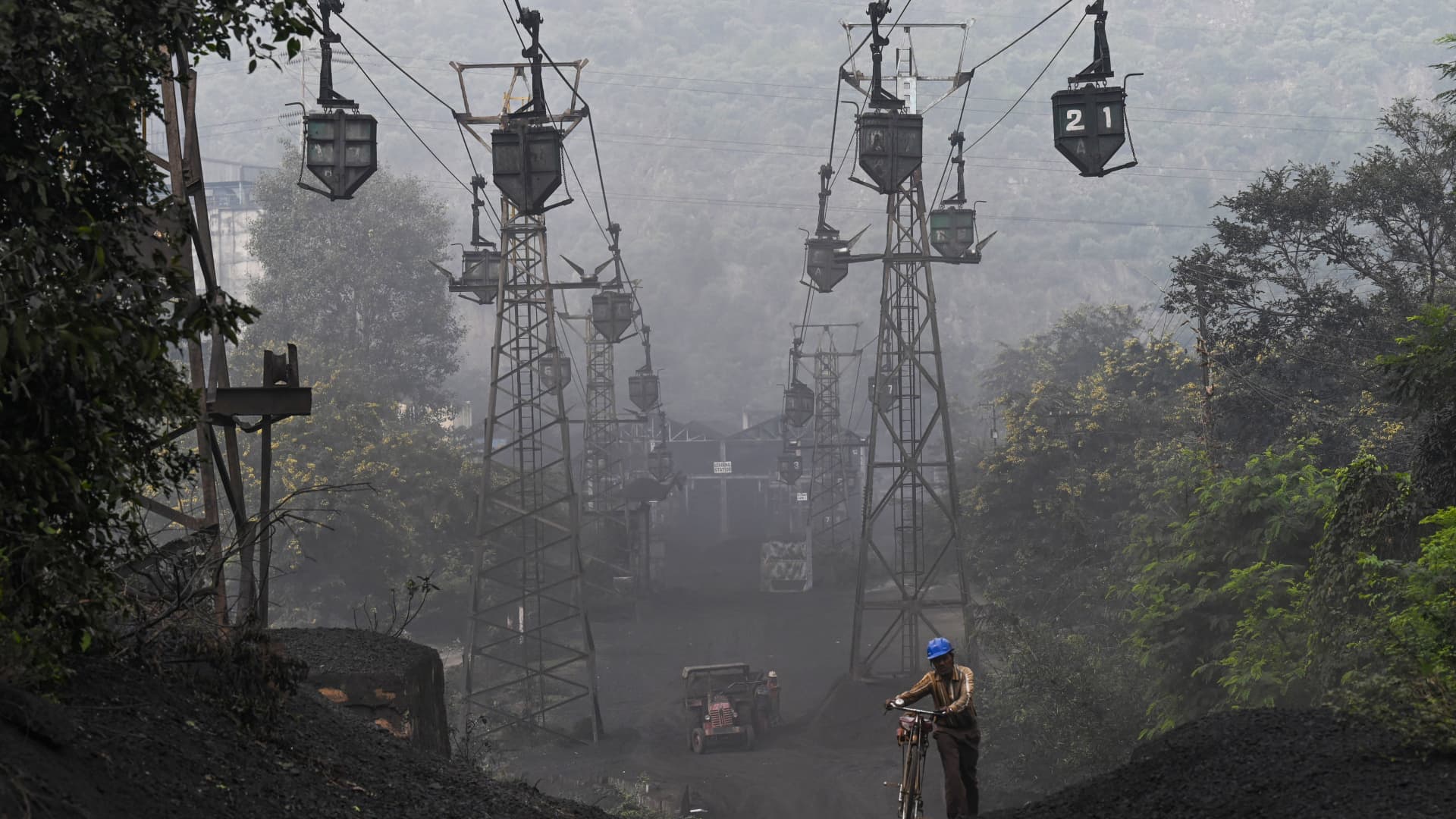 A worker pushes his bicycle under a line of cable trolleys transporting coal in Uttar Pradesh, India, on Nov. 19, 2021.