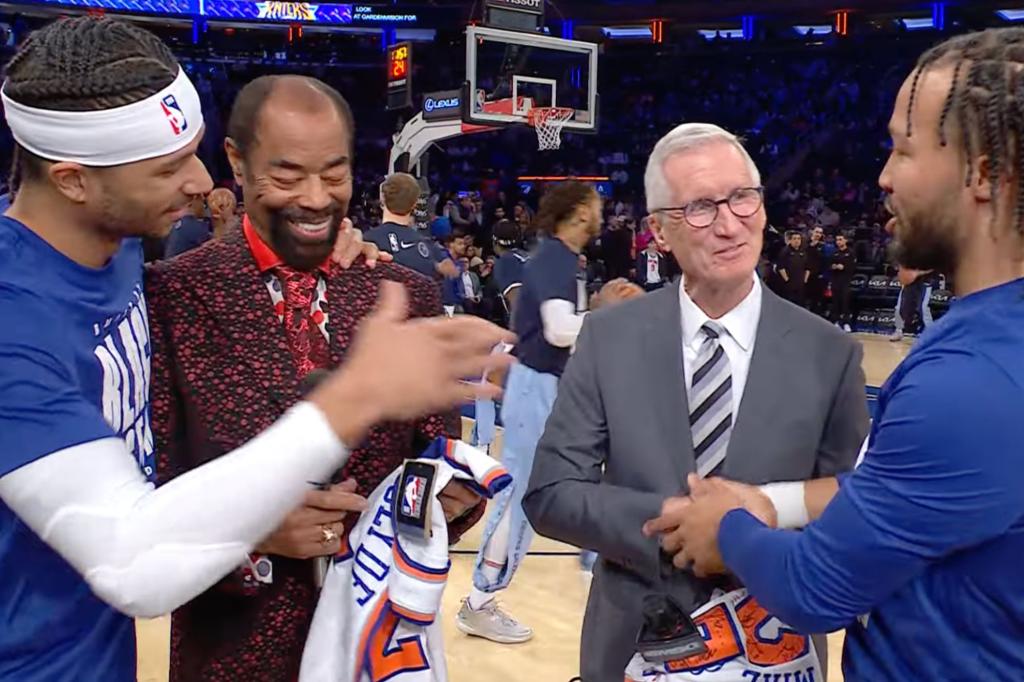 Jalen Brunson and Josh Hart went up to the two broadcasters just as they were opening the telecast to hand the two signed jerseys with the No. 25 in honor of the anniversary.