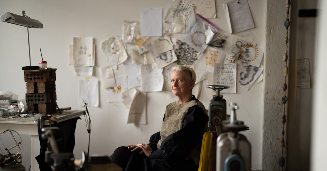 Ms. Geib’s sprawling studio, where she has worked for 15 years, is cluttered with books, textiles and weaving materials. There are scores of tools and bits of jewelry around her workbench, as well as trays of gemstones, piles of curlicue-shaped silver and gold strands, and works of jewelry in progress.
