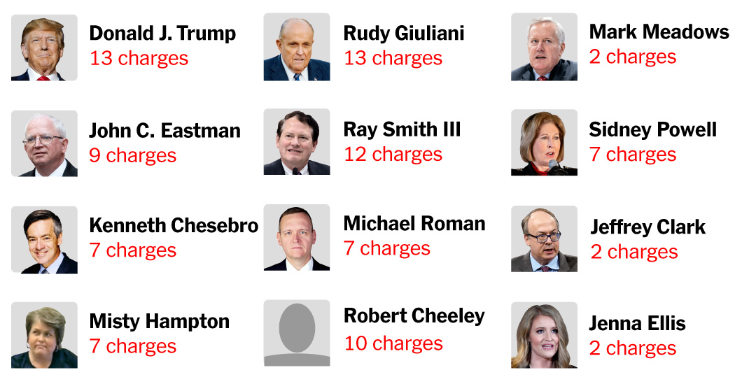 The indictment Georgia prosecutors filed Monday in an election interference case targeting former President Donald J. Trump and his associates includes 41 criminal charges against 19 people who are accused of helping him seek to overturn his 2020 election loss.