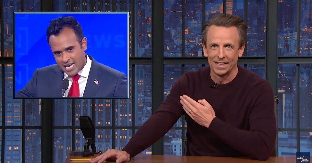 During Wednesday night’s Republican debate, Vivek Ramaswamy rattled off several conspiracy theories — “including the far-out idea that Vivek Ramaswamy could become president,” Seth Meyers joked on Thursday.