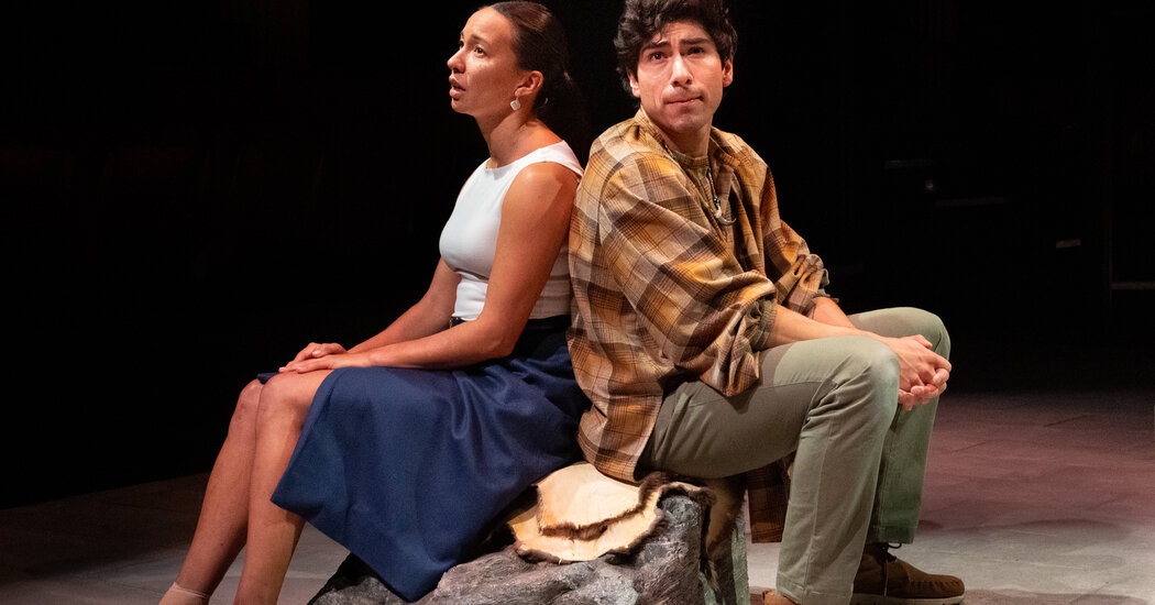 Directed by Laurie Woolery, the production shifts seamlessly between the alternating time periods and locales, on a wilderness-meets-boardroom set by Marcelo Martínez García, and with particular help from Lux Haac’s costumes, whose fusion of fabrics and styles (a pinstripe pilgrim silhouette, for example) accomplish an impressive narrative arc on their own.