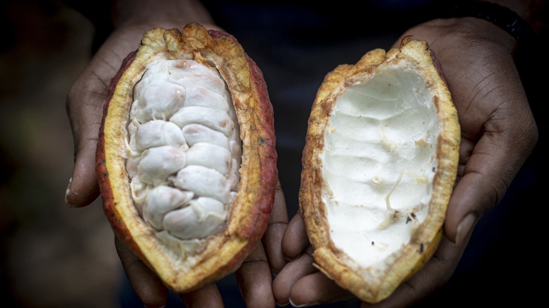 Detail of a recently opened cocoa pod in Asikasu on December 19, 2020. The beans will be leave to ferment for 5 days before put them under the sun to dry them. (Photo by CRISTINA ALDEHUELA / AFP) (Photo by CRISTINA ALDEHUELA/AFP via Getty Images)