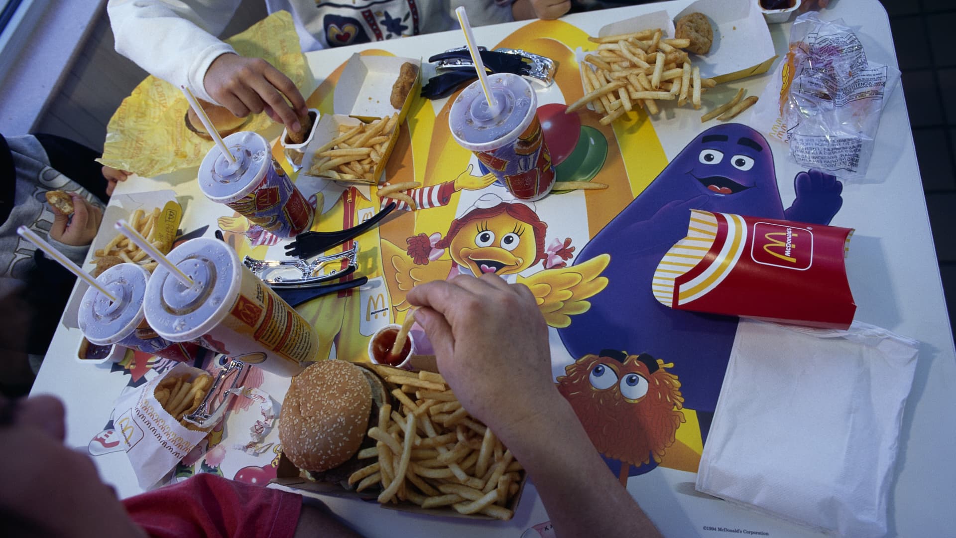 Children eating hamburgers, french fries, and chicken nuggets from McDonald’s.