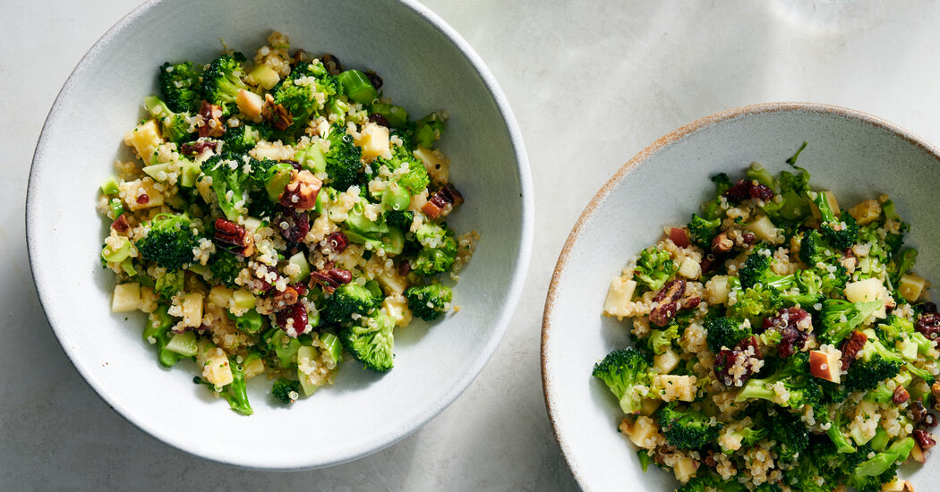 For the uninitiated, resolving to eat more vegetarian meals may sound like resigning yourself to a future of listless salads. Don’t let that myth deter you. Sohla El-Waylly’s quinoa and broccoli spoon salad is proof that salads can be plenty hearty, crunchy and balanced without a blanket of grilled chicken on top. The unexpected combination of flavors and textures here — raw broccoli, crunchy nuts, dried and fresh fruit, nubby grains and salty cheese — only get better as it sits, ideal for packed lunches when you’re back to your post-holiday routines.