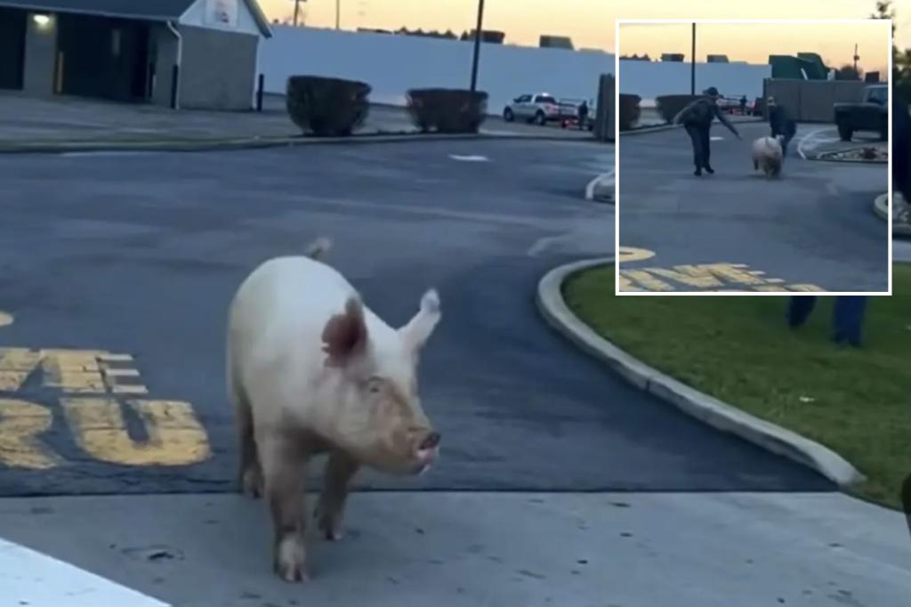 The footage shows a trooper and the pig’s owner leading the defiant animal away from the fast-food restaurant.