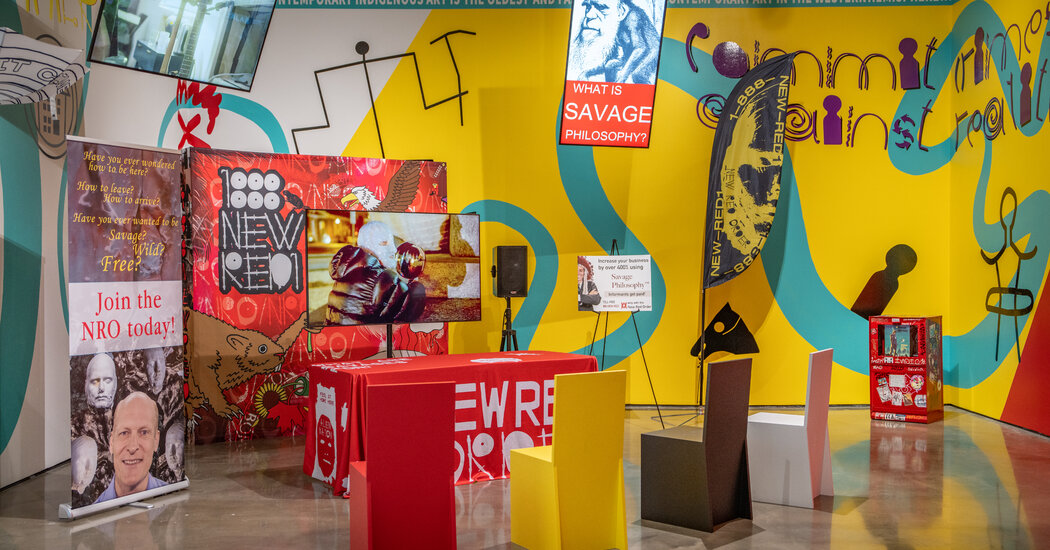 There’s no such ban in effect in the loquacious audiovisual installation, “Conscientious Conscripture,” that is the New Red Order (N.R.O.) headquarters. Founded by the artists Jackson Polys, Adam Khalil and Zack Khalil, the collective’s project is essentially an extended satirical performance, soaked in dark humor and intent on exposing America’s love/hate relationship with Native culture, which it has embraced in fantasy form and in reality made every effort to erase. N.R.O.’s goal is to get beyond land acknowledgments and diversity box-checking to, in its own words, “promote Indigenous futures and collect on colonial debts.”