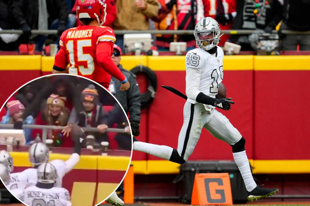 The 26-year-old was celebrating a 33-yard pick-six of Patrick Mahomes in the second quarter — Las Vegas’ second defensive score in just seven seconds of gameplay — when he veered toward the Arrowhead Stadium crowd.