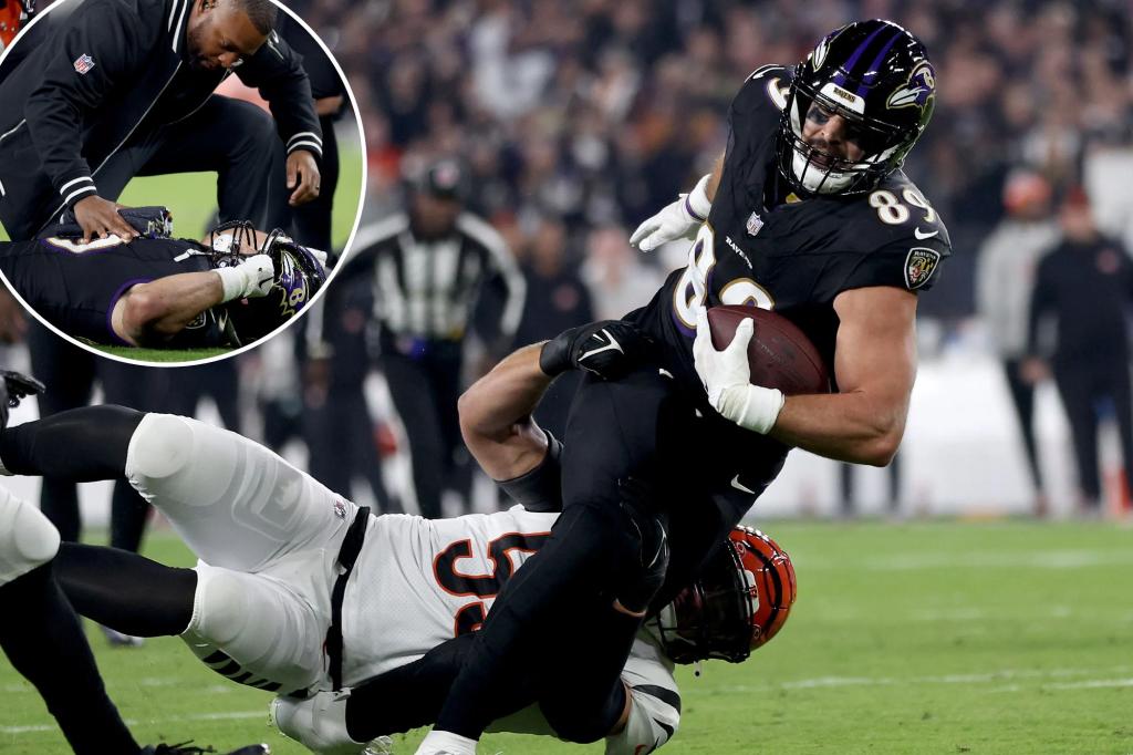 Ravens tight end Mark Andrews was ruled out for the remainder of “Thursday Night Football” against the Bengals after suffering an ankle injury during an awkward tackle in the first quarter.