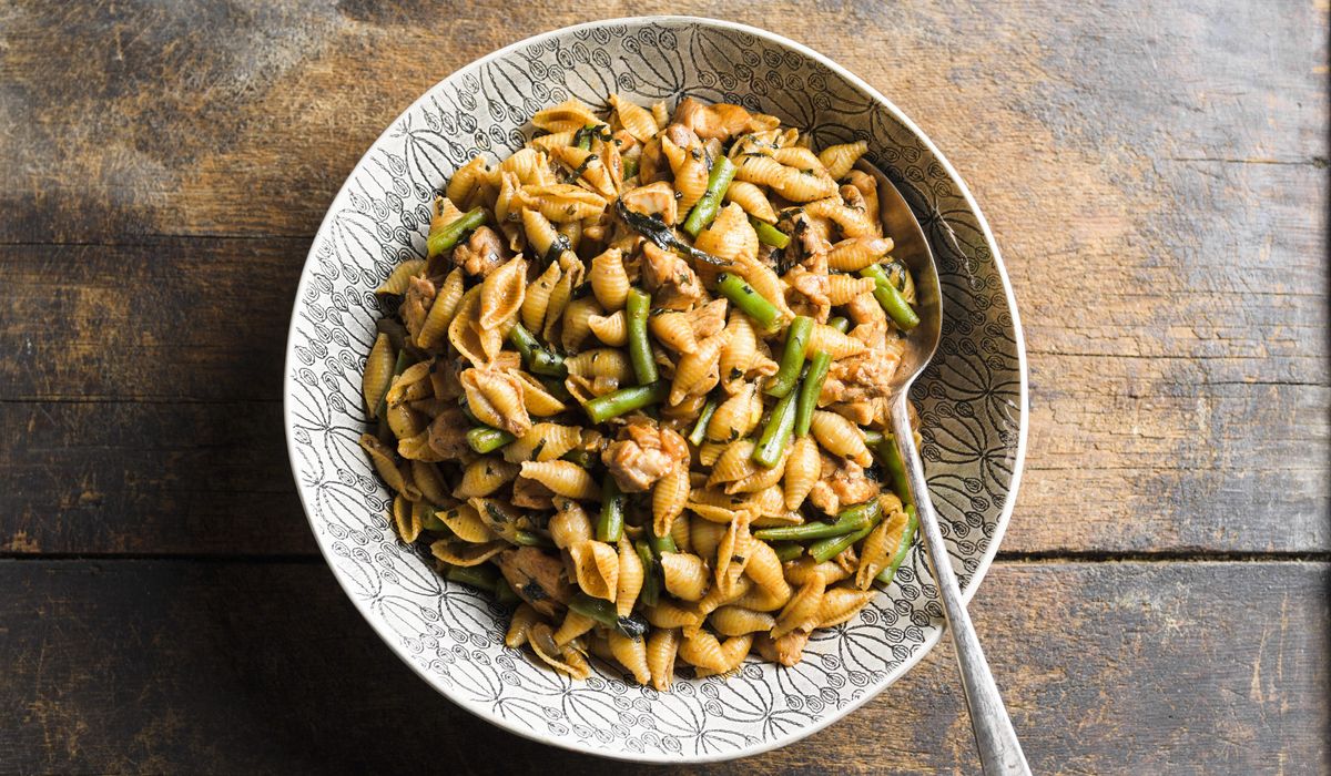For our version from our book “Milk Street Tuesday Nights, Mediterranean,” which limits recipes to 45 minutes or less, we brown chicken thighs, then cook pasta shells in a spiced tomato sauce spiked with harissa, a North African spice paste. The harissa is a simple way to incorporate both chili heat and a mixture of aromatic spices.