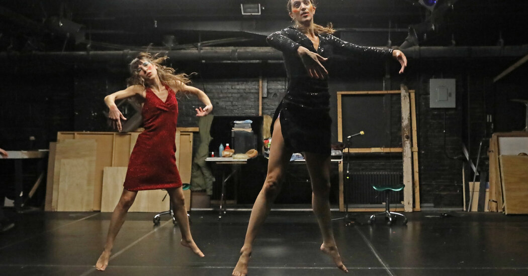 During periodic blackouts we learn that Fagan and Engelstein aren’t alone. Hannah Mitchell serves as a straight-faced stagehand, who applies too much makeup to the women by the light of a headlamp. The performance space is a rehearsal studio that hasn’t been gussied up much, and the performers make full use of it. They take food and wine from the refrigerator and consume it next to a microphone. (Trips to the offstage toilet are also amplified.) They use the microwave. They stand in the sink.
