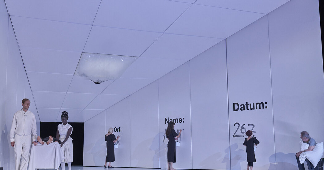 The German-language stage adaptation, by Henkel and the dramaturg Tobias Schuster, hews closely to the French screenplay. At the same time, they employ strategies to defamiliarize the piece. The dialogue is heightened by frequent, often uncanny repetition. And many of the script’s stage directions are read out loud by two actors, Joyce Sanhá and Christian Löber, whose limber performances — as narrators, nurses and other characters — add to the production’s anxious, off-kilter energy.