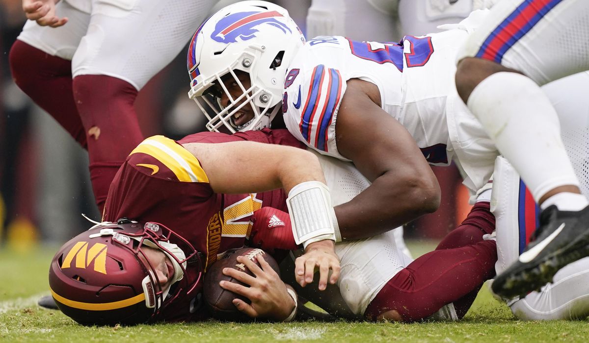 The Bills took them all back to Buffalo with them, along with a 37-3 win over the Commanders, who had the ball 11 times and turned it over five times — four Sam Howell interceptions and an Antonio Gibson fumble.