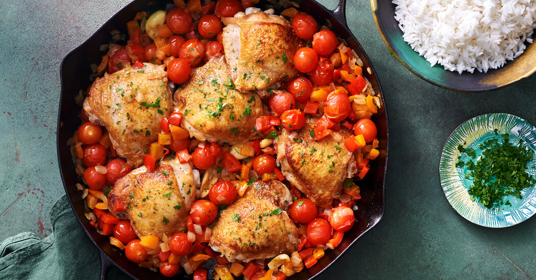 Yewande Komolafe makes one-pan magic with saucy bell peppers, onions and cherry tomatoes. This new recipe cooks entirely on your stove — no oven — and seamlessly bridges summer and fall.