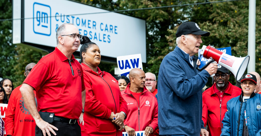 His remarks came just hours after President Biden, at the invitation of Mr. Fain, joined a picket line outside a General Motors facility in Belleville, Mich., near Detroit.