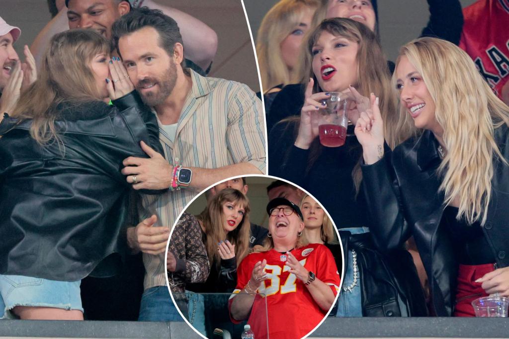 Other images of the pop icon showed her intensely watching a play on the field, laughing next to Hollywood A-listers and married couple Ryan Reynolds and Blake Lively, and whispering something Reynolds’ ear.