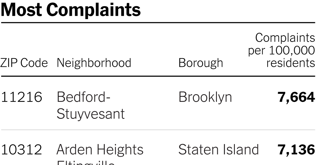 New York landed in 17th place, with 3,728 complaints per 100,000 residents, or less than a tenth of Baltimore’s rate. Of course, not every neighborhood is equally swept, as shown in this week’s chart. Using ZIP codes to home in on major neighborhoods, the study found that the least sparkling was 11216 — Bedford-Stuyvesant for our purposes — with 7,664 complaints per 100,000 residents. Four Brooklyn ZIP codes were among the city’s dirtiest 10. Four were in Staten Island, and there was one each in the Bronx and Manhattan.