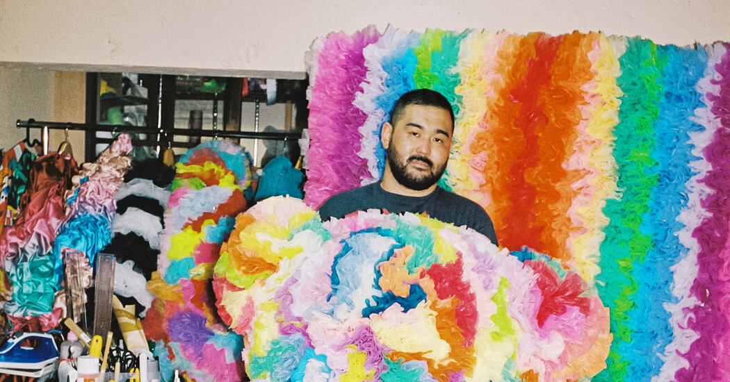 BEFORE THE JAPANESE fashion designer Tomo Koizumi started making giant ruffled dresses out of neon-bright polyester organza — sometimes up to 90 yards of it for a single gown, worn by singers like Lady Gaga and Sam Smith — he spent nearly a decade in obscurity creating costumes for local performers, many of whom worked in Tokyo’s underground queer nightlife scene. Before that, Koizumi, 35, studied sculpture, painting and drawing at Chiba University, in the suburb where he grew up, hoping to become a children’s art teacher. Last summer, the gallerist Yukiko Mizutani heard him talk about his background on television and sought out the designer, one of fashion’s rising talents, to tell him that he should try being a visual artist himself.