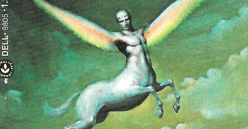 The mystery cover art shows a strapping centaur with delicate wings flying above a menacing green face with bright red eyes. Craggy mountains and fluffy dark clouds surround the haunting figures. The website Book Riot called the art “nightmare fuel.” The artist’s name isn’t mentioned anywhere in the book.