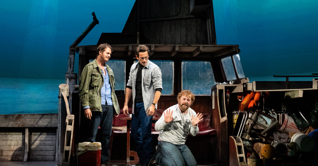 All of that is faithfully rendered in “The Shark Is Broken,” which opened on Thursday at the Golden Theater, in a production directed by Guy Masterson. There’s a perfect replica of the Orca bobbing prettily on a C.G.I. sea, and costumes minutely matched to the film. (Duncan Henderson is the designer.) Accents, postures, props and hairstyles are fanatically accurate; there’s even a hat-tip (by Adam Cork) to John Williams’s sawing, rasping theme at the start.