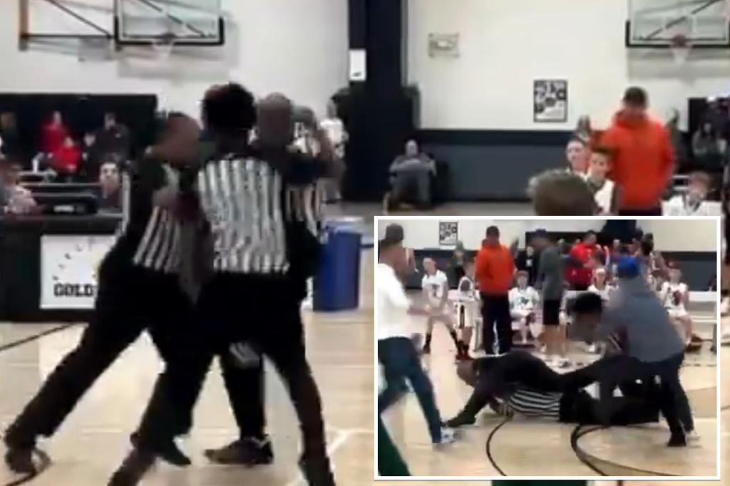 Three refs at a Colorado youth basketball game threw punches and tackled each other in the middle of a court surrounded by horrified onlookers, shocking video shows.